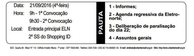 O STIU-DF convoca os trabalhadores e trabalhadoras da Eletronorte para importante assembleia geral deliberativa na próxima quarta-feira (21), às 9h30, conforme a seguir: