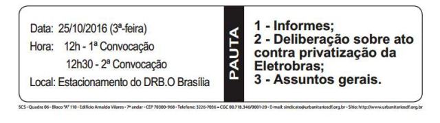 O STIU-DF convoca os trabalhadores e trabalhadoras de Furnas para importante assembleia geral deliberativa, conforme a seguir: