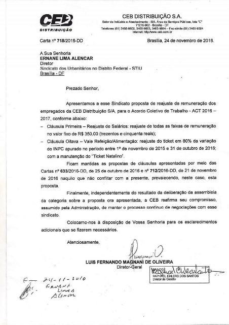 A nova proposta inclui o reajuste de todas as faixas de remuneração no valor fixo e linear de R$ 350,00 (trezentos e cinquenta reais), a aplicação no tíquete de 80% da variação do INPC apurado no período entre 1º de novembro de 2015 e 31 de outubro de 2016, além da manutenção do tíquete natalino. Para as demais cláusulas ficam mantidas as negociações anteriores.