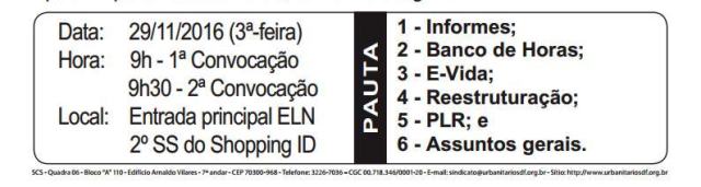 O STIU-DF convoca os trabalhadores e trabalhadoras da Eletronorte para participarem de importante assembleia geral a realizar-se nesta terça-feira, dia 29, conforme a seguir: