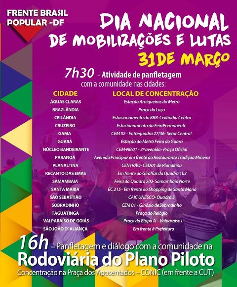 No Distrito Federal, sindicatos e movimentos populares, convocados pela CUT Brasília, farão panfletagem nas regiões administrativas, nos municípios do Entorno e em pontos estratégicos de Brasília, para esclarecerem à população o quanto as medidas do governo golpista de Michel Temer são danosas para todos. As reformas previdenciária e trabalhista, além da terceirização, são pontos que ameaçam e atacam à classe trabalhadora, principalmente, as mulheres.
