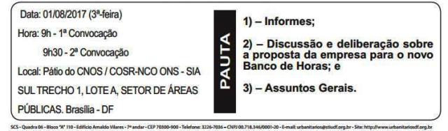 O STIU-DF convoca os trabalhadores e trabalhadoras do ONS para importante assembleia deliberativa nesta terça-feira, dia primeiro, conforme a seguir: